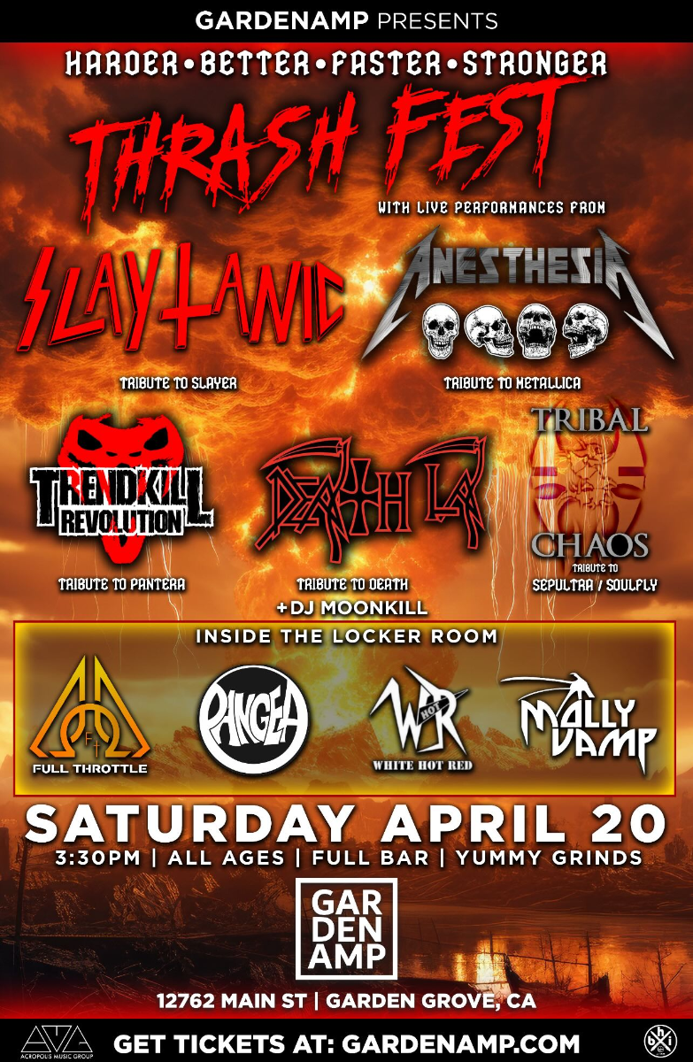 with Slaytanic, Anesthesia (Metallica tribute), Trendkill Revolution (Pantera Tribute), Death LA (Tribute to Death), Tribal Chaos (Tribute to Sepultra / Soulfly), Full Throttle, Pangea, White Hot Red, Molly Vamp