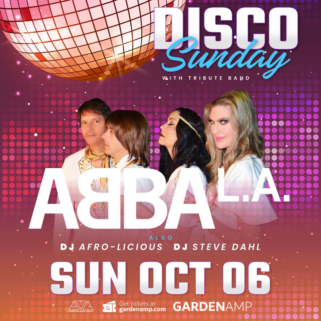 Calling all the Dancing Queens! Dance the night away at Disco Sundays with an amazing ABBA tribute; ABBA LA with DJ Disco Stu at The Garden Amp! Experience the best of disco music live....as you can dance, you can jive, having the time of your life!